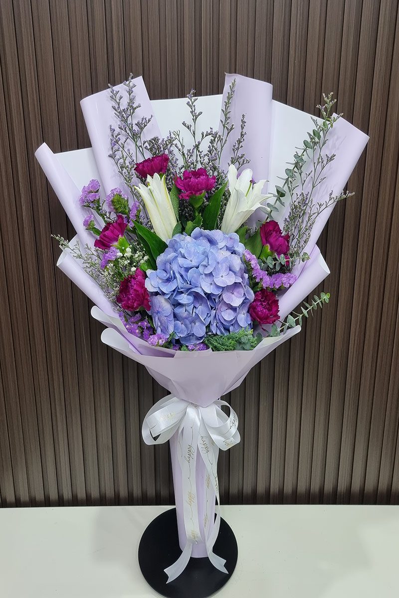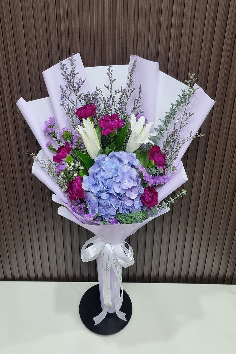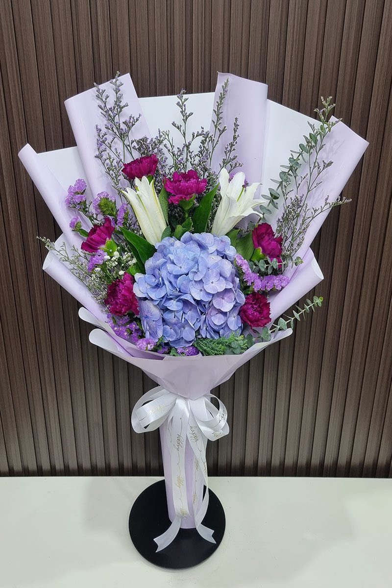 ดอกไฮเดรนเยีย สีม่วง ดอกคาเนชั่น  และดอกลิลลี่ จัดช่อ แซมดอกยิปซี
