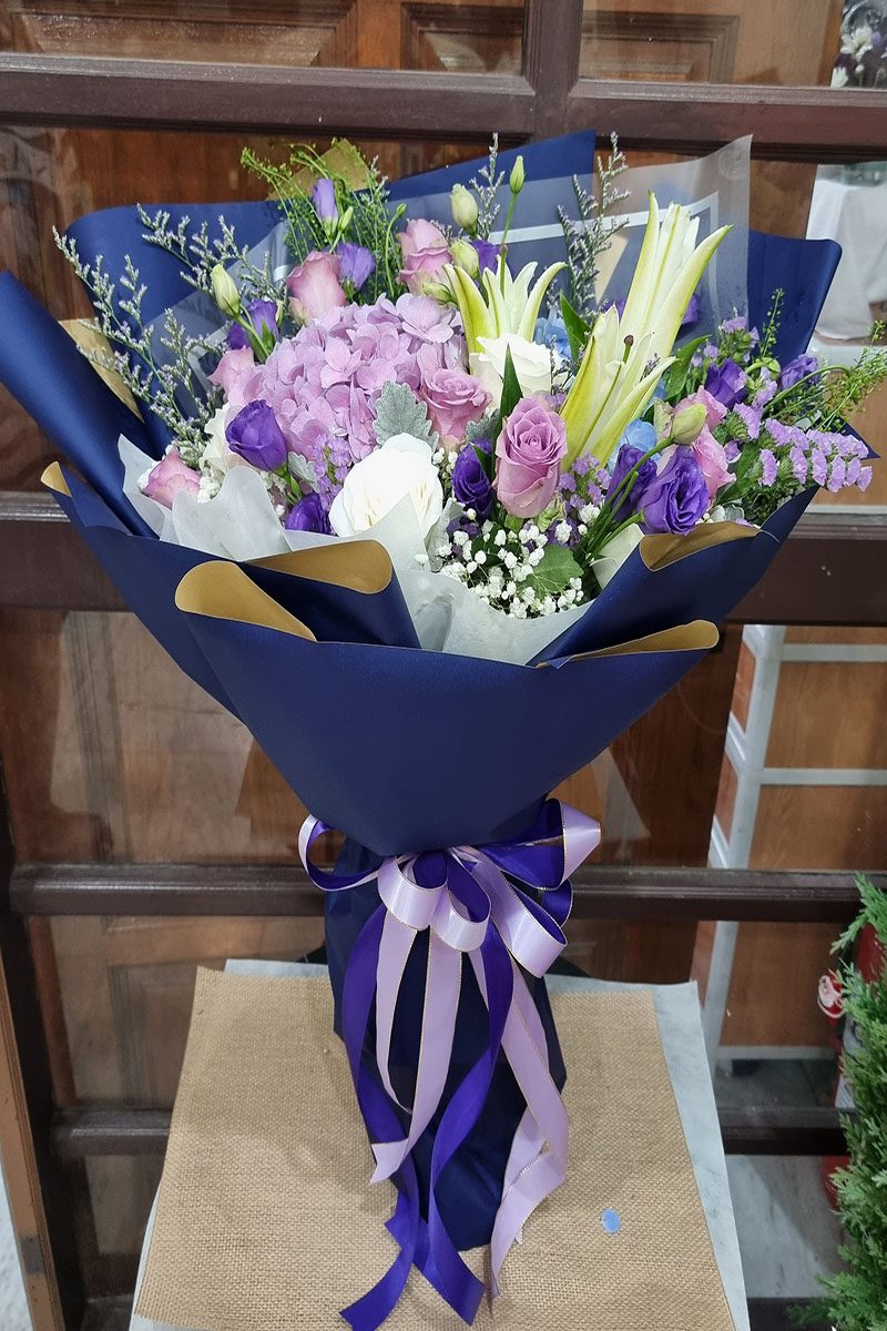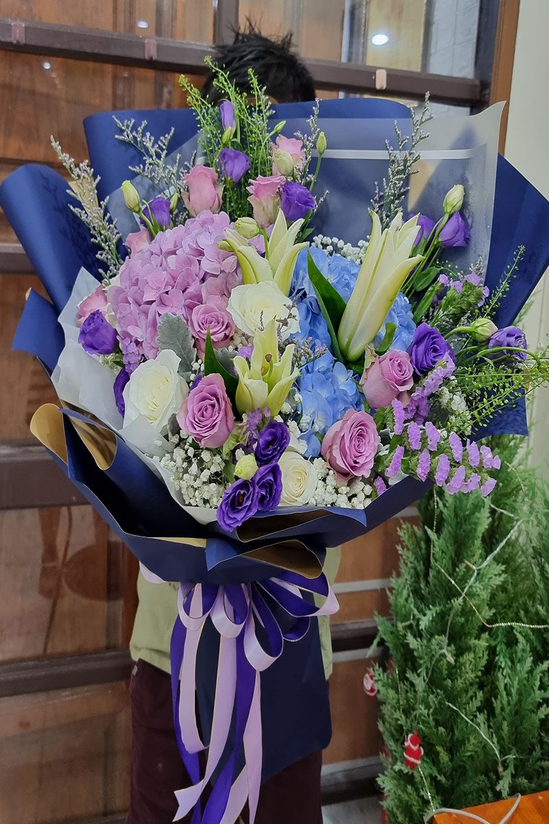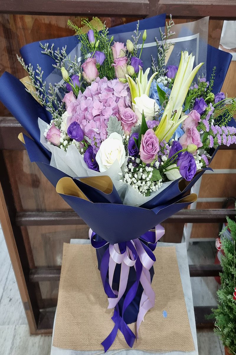 ดอกไฮเดรนเยีย ดอกกุหลาบสีม่วง ดอกลิลลี่  จัดช่อ แซมดอกยิปซี