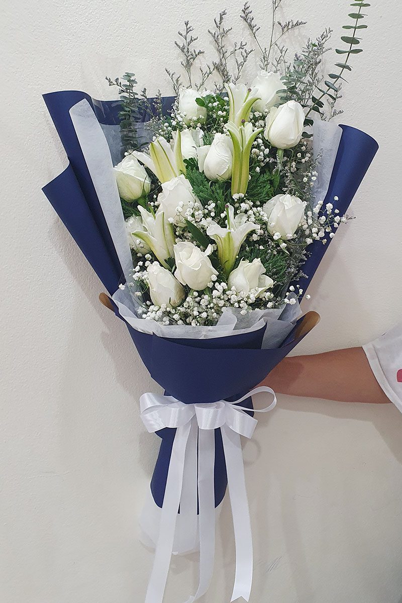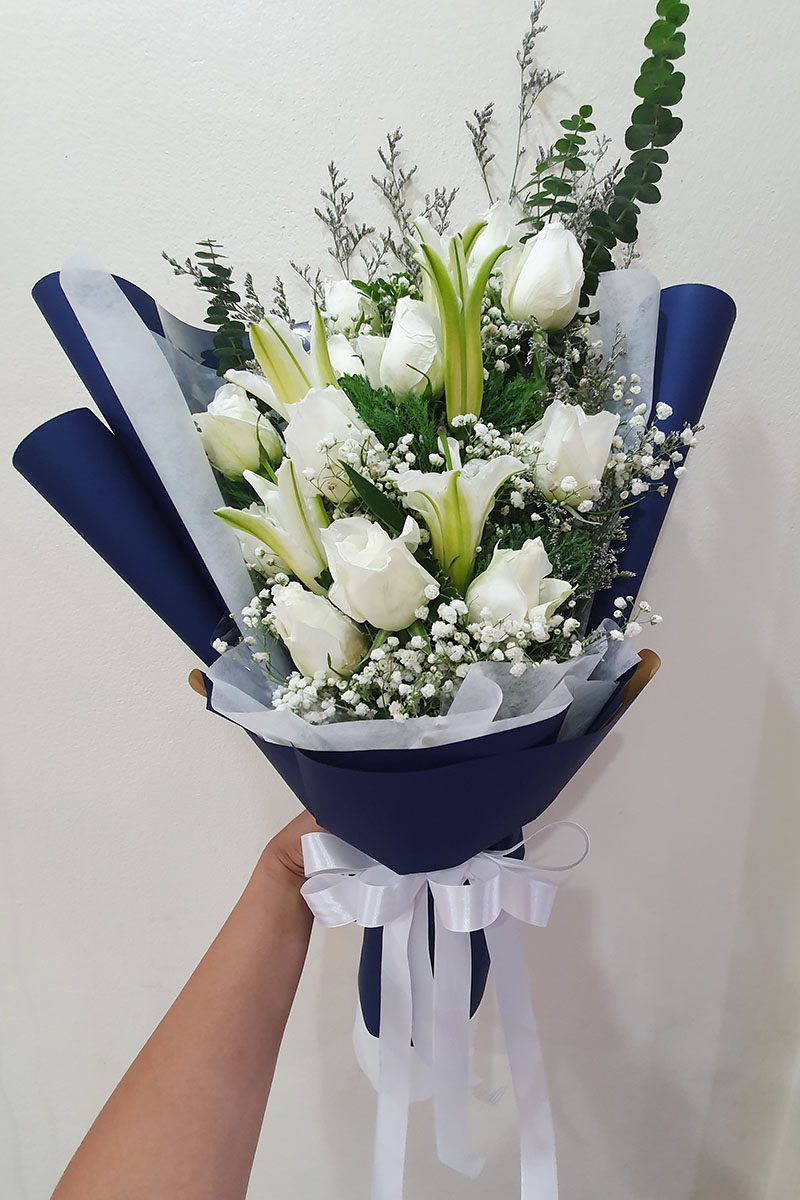 ดอกกุหลาบกุหลาบ ดอกลิลลี่  จัดช่อ แซมดอกยิปซี แคสเปียร์