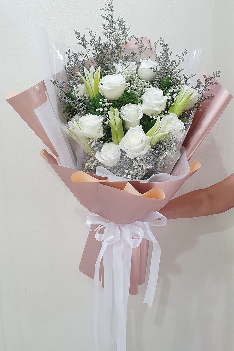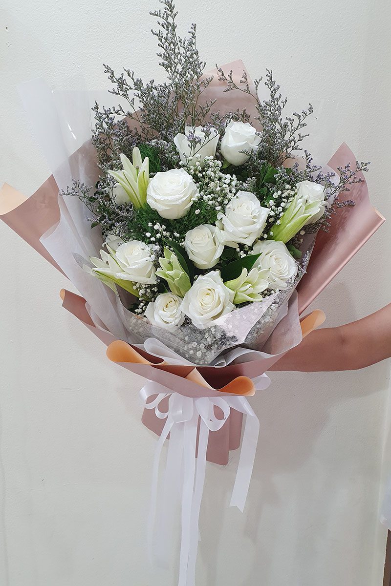 ช่อดอกกุหลาบลิลลี่ขาว ห่อสีขาว