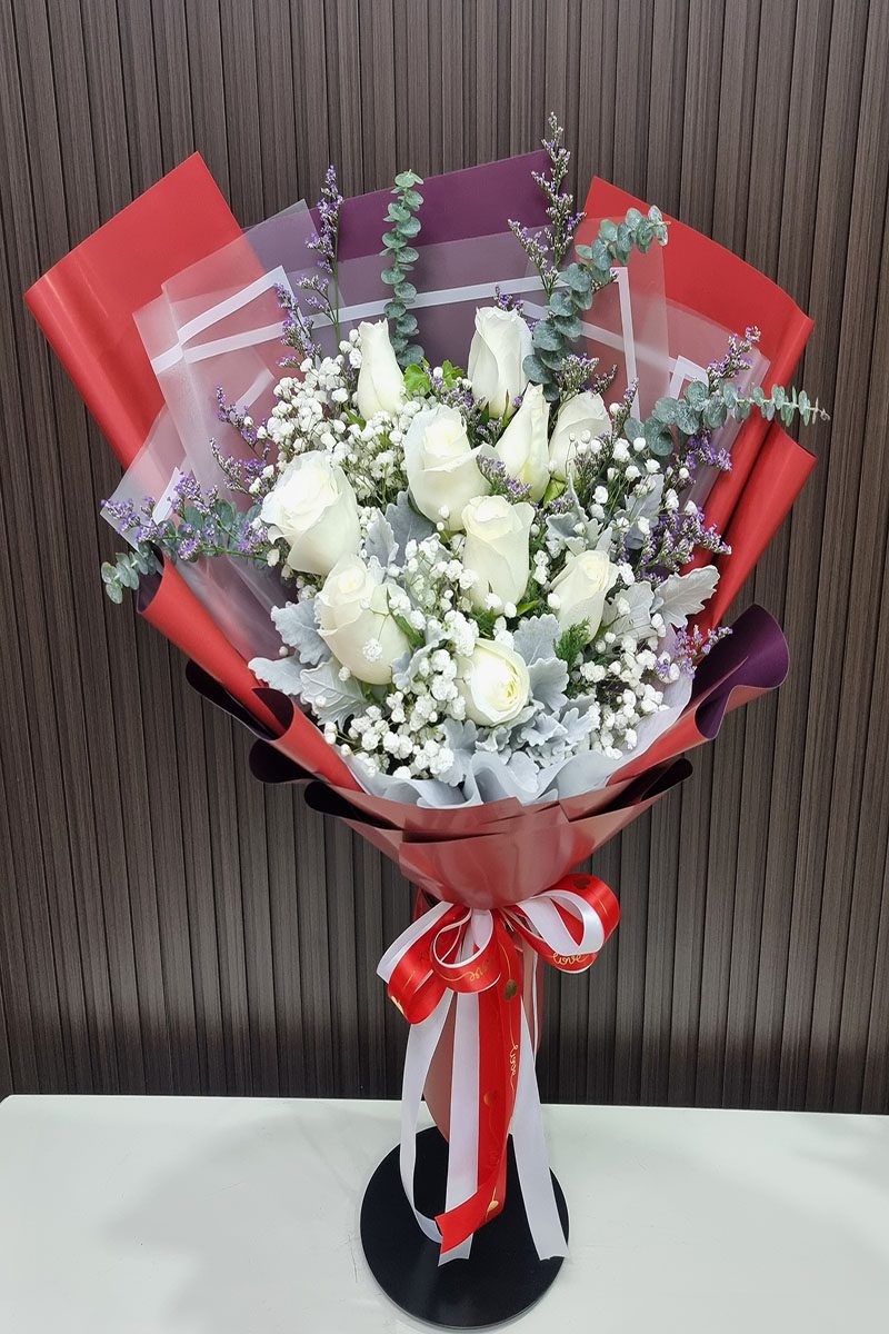 ความหมาย: ช่อดอกกุหลาบสีขาว สื่อถึง ความรักที่บริสุทธิ์ ซื่อสัตย์ ภักดี ไร้เดียงสา สง่างาม และ ศรัทธา เหมาะสำหรับมอบให้กับบุคคลพิเศษ ในโอกาสต่างๆ เช่น แสดงความยินดี แสดงความไว้อาลัย หรือมอบให้กับผู้ป่วย เพื่อเป็นกำลังใจ