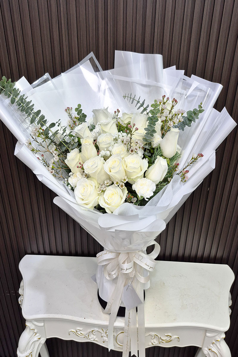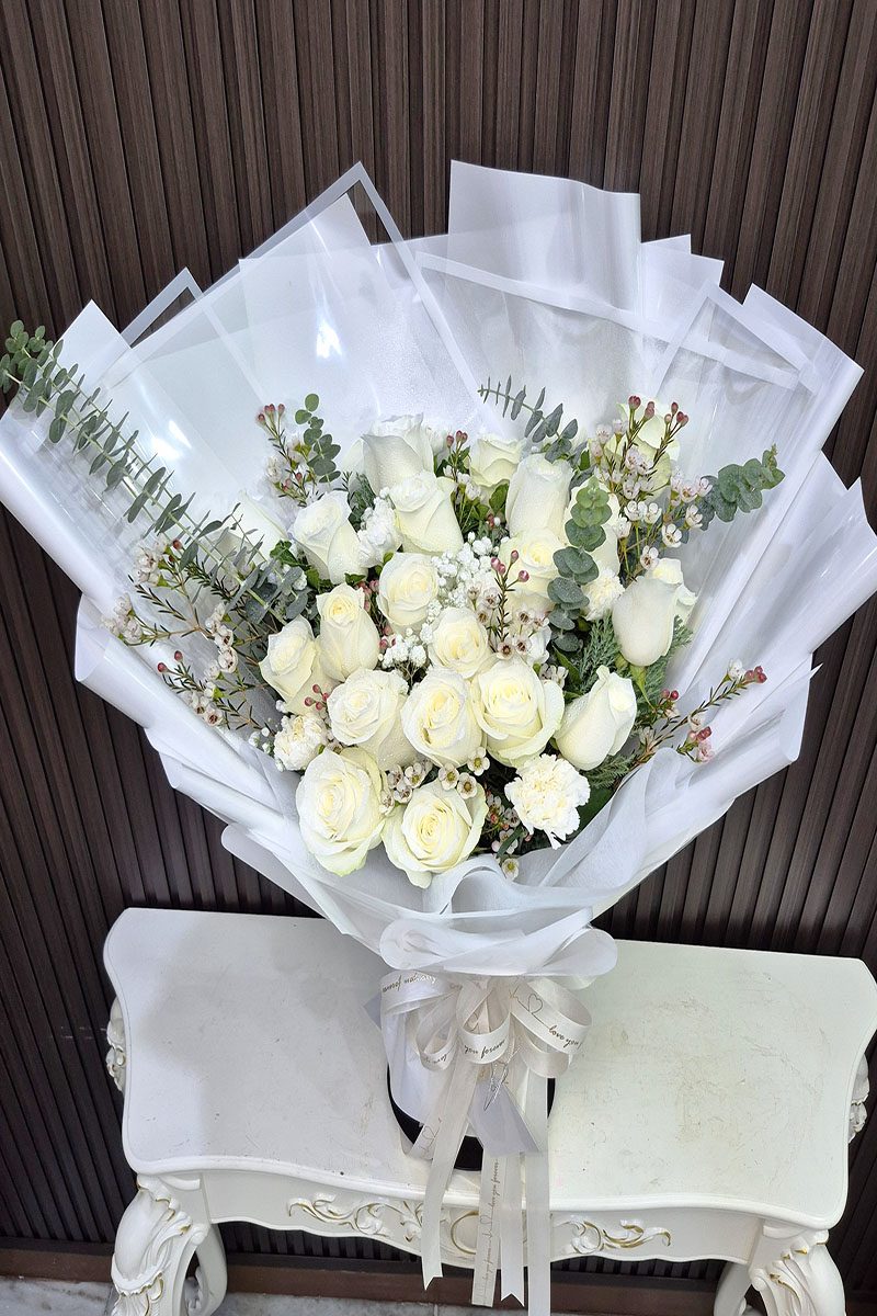 ความหมาย: ช่อดอกกุหลาบสีขาว สื่อถึง ความรักที่บริสุทธิ์ ซื่อสัตย์ ภักดี ไร้เดียงสา สง่างาม และ ศรัทธา เหมาะสำหรับมอบให้กับบุคคลพิเศษ ในโอกาสต่างๆ เช่น แสดงความยินดี แสดงความไว้อาลัย หรือมอบให้กับผู้ป่วย เพื่อเป็นกำลังใจ