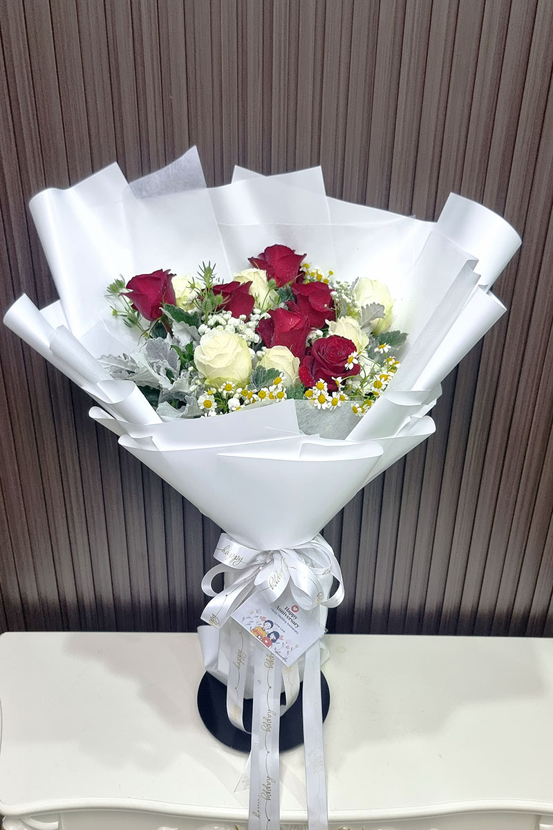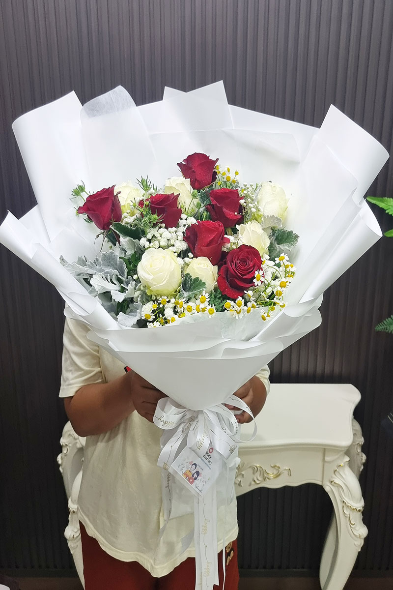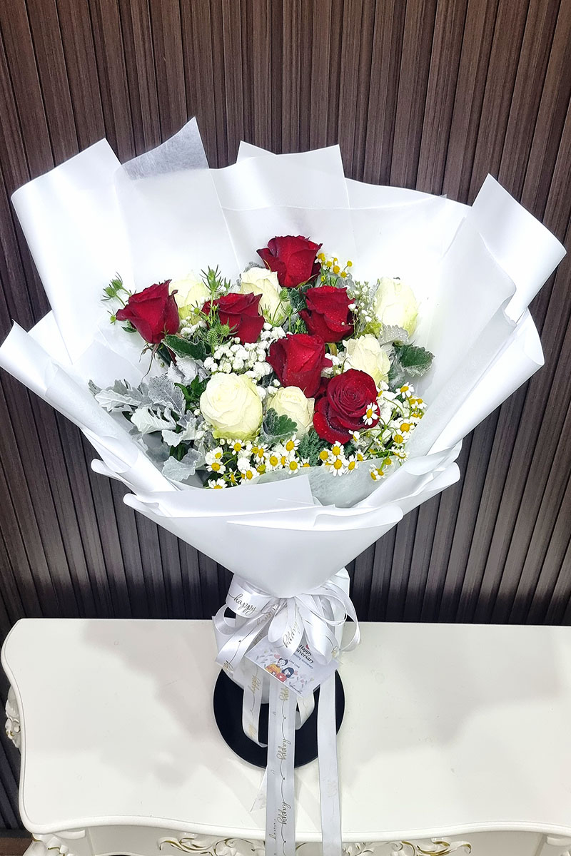 ช่อดอกกุหลาบสีขาว+แดง ประกอบไปด้วยดอกไม้ หลักคือ