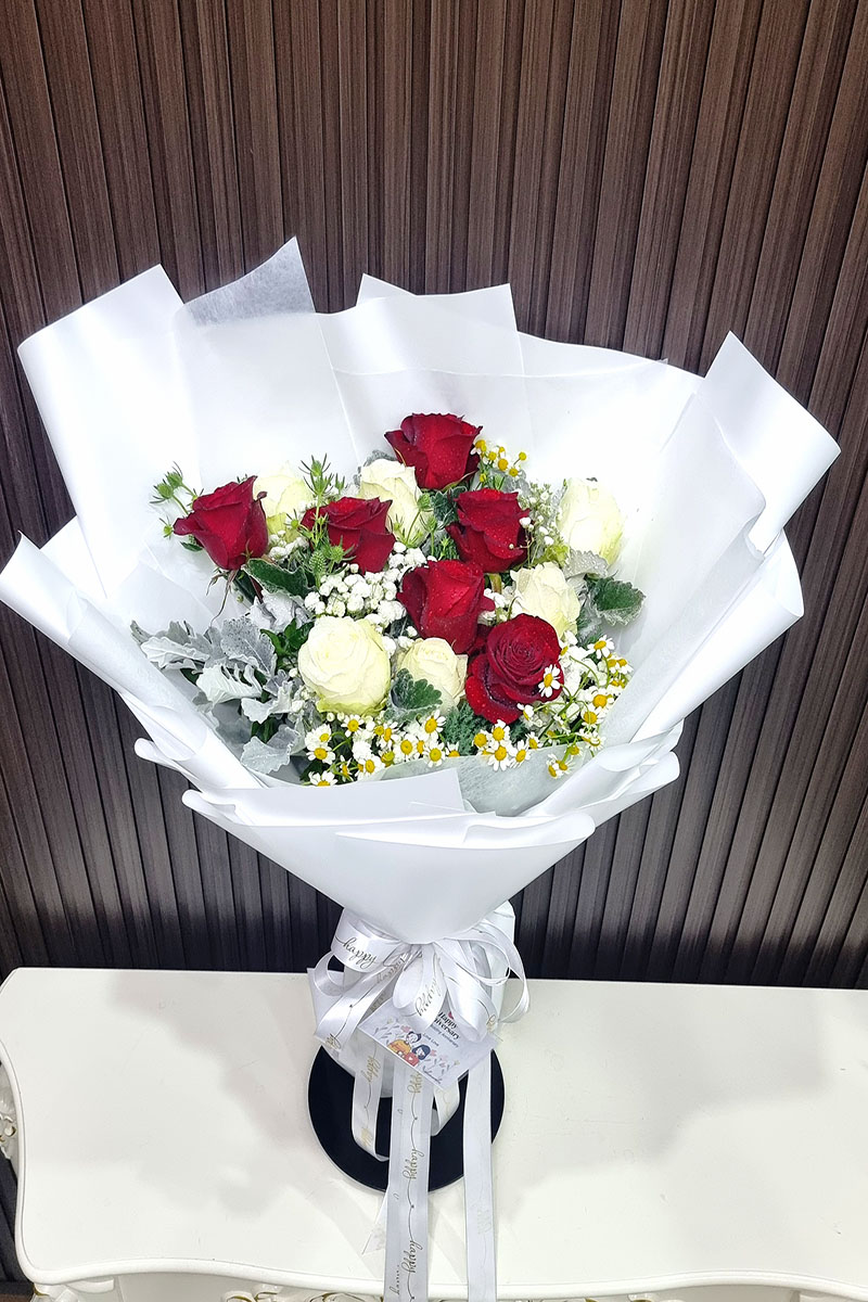 ดอกกุหลาบสีขาว5 ดอก แดง 5 ดอก จัดช่อ แซมดอกยิปซี