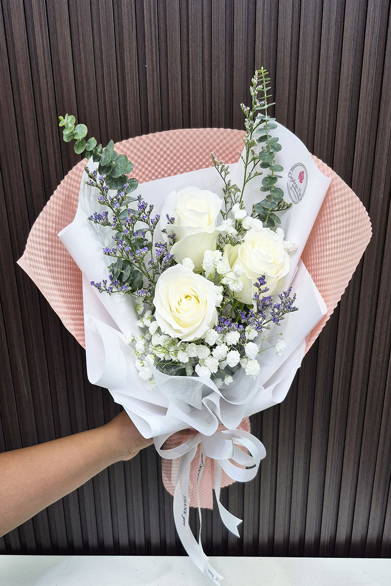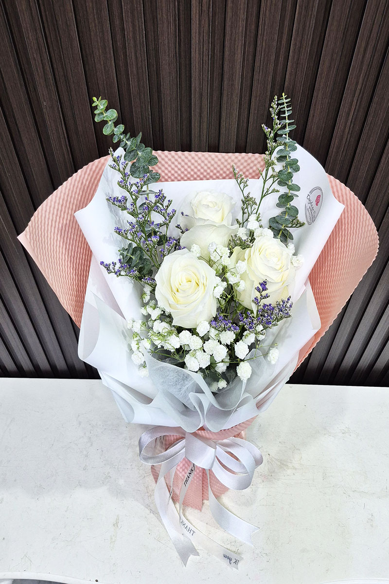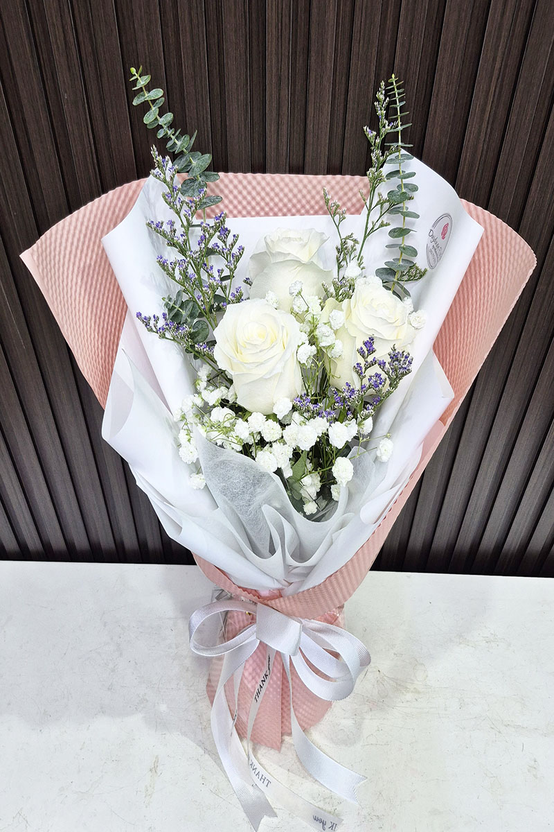 ดอกกุหลาบสีขาว 3 ดอก จัดช่อ แซมดอกยิปซี แคสเปียร์