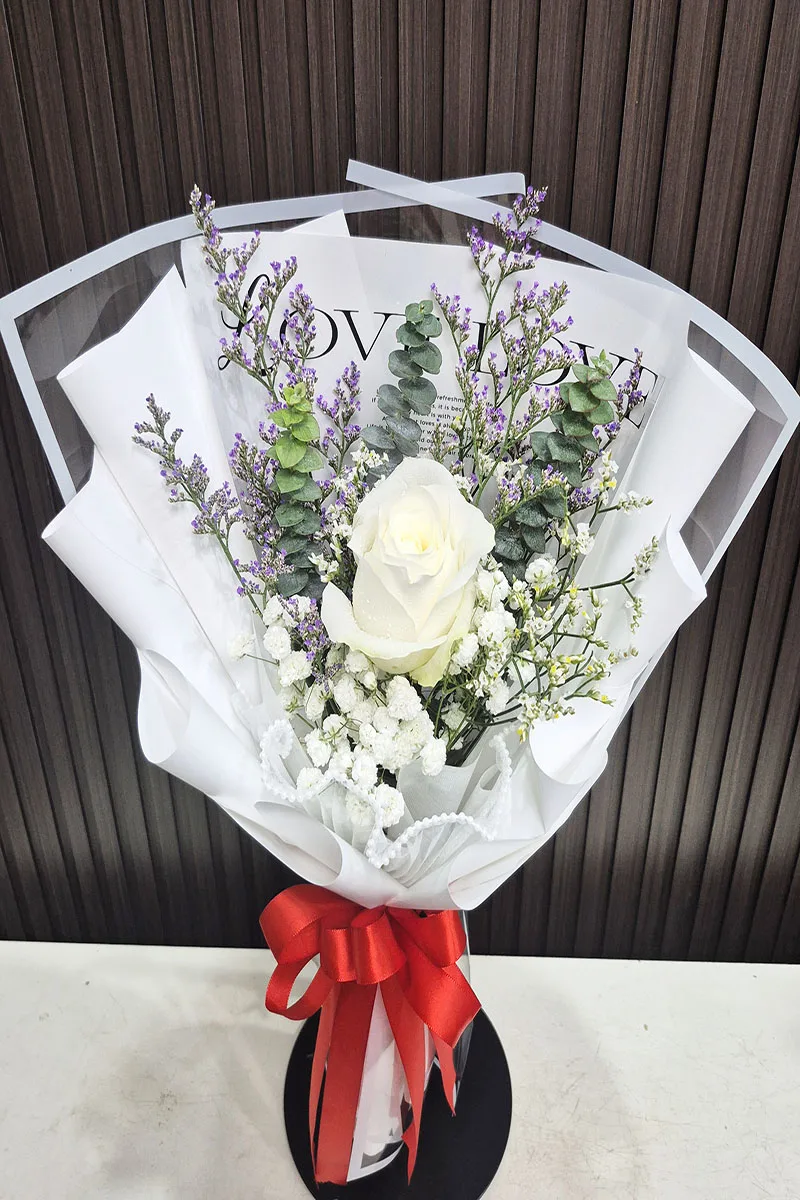 ดอกกุหลาบสีขาว 1 ดอก จัดช่อ แซมดอกยิปซี แคสเปียร์