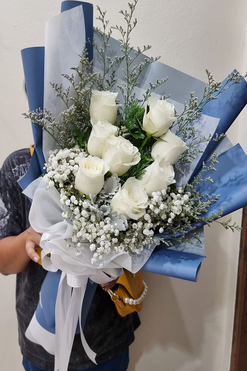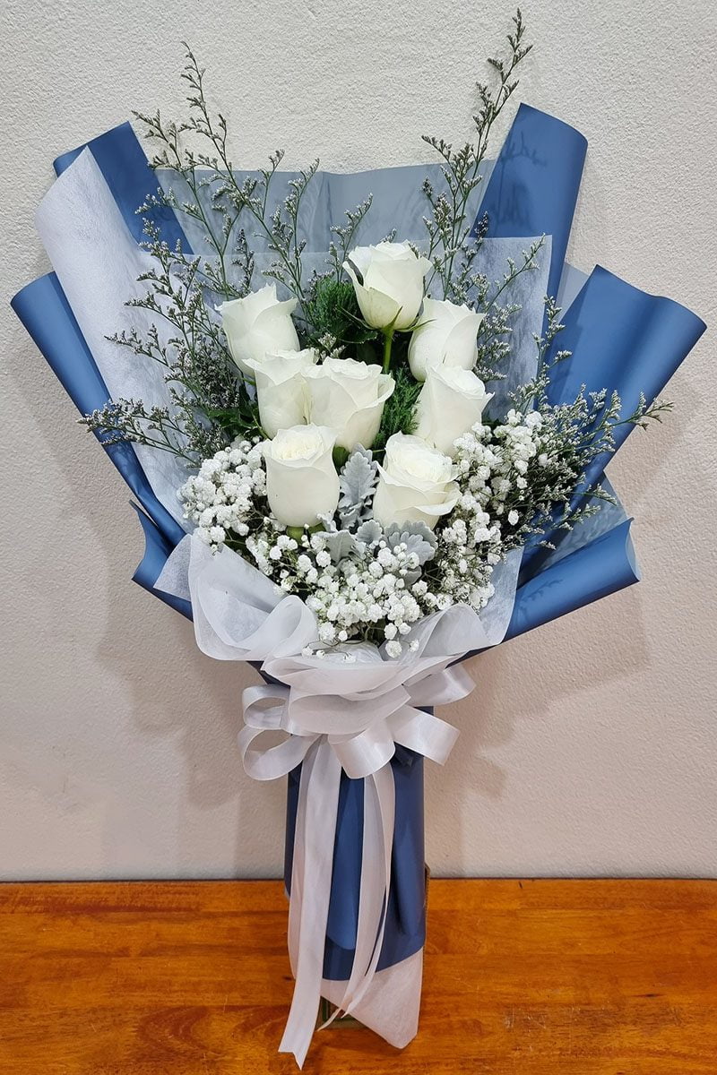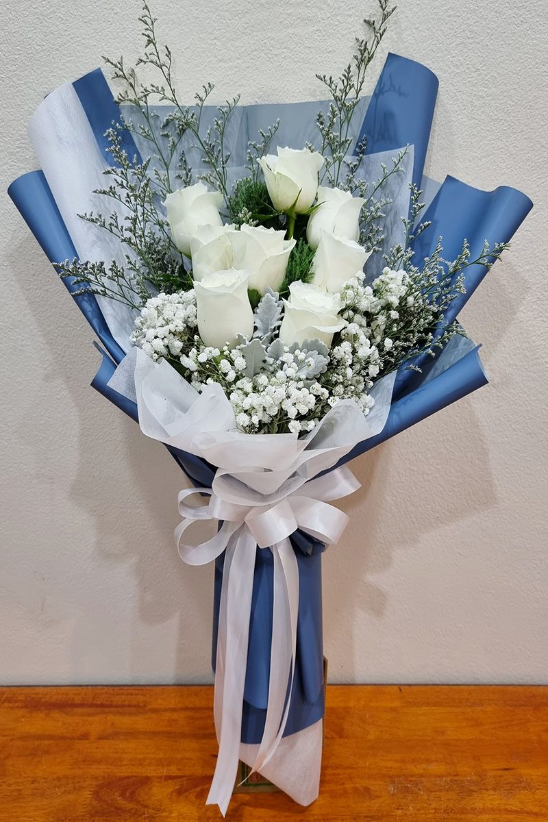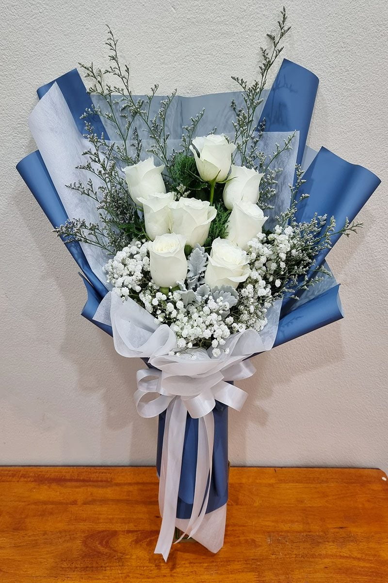 ความหมาย: ช่อดอกกุหลาบสีขาว สื่อถึง ความรักที่บริสุทธิ์ ซื่อสัตย์ ภักดี ไร้เดียงสา สง่างาม และ ศรัทธา เหมาะสำหรับมอบให้กับบุคคลพิเศษ ในโอกาสต่างๆ เช่น แสดงความยินดี แสดงความไว้อาลัย หรือมอบให้กับผู้ป่วย เพื่อเป็นกำลังใจ